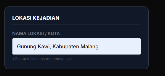 Format: Tulis nama tempat spesifik di depan, diikuti nama Kabupaten atau Kotanya di belakang.