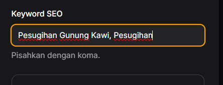 Sebelum menulis, bayangkan apa yang akan diketik orang di Google saat mencari ceritamu. Itulah yang disebut Kata Kunci. Tambahkan kata kunci kedua dan ketiga dengan memisahkannya dengan koma. Untuk kepadatan kata kunci dihitung dari penulisan keyword pertama (Pesugihan Gunung Kawi).