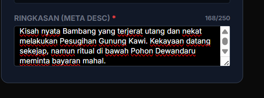 Di formulir penulisan, ada kolom bernama Meta Deskripsi atau Deskripsi Singkat. Ini adalah kalimat pendek yang akan muncul di bawah judul saat orang mencari di Google.